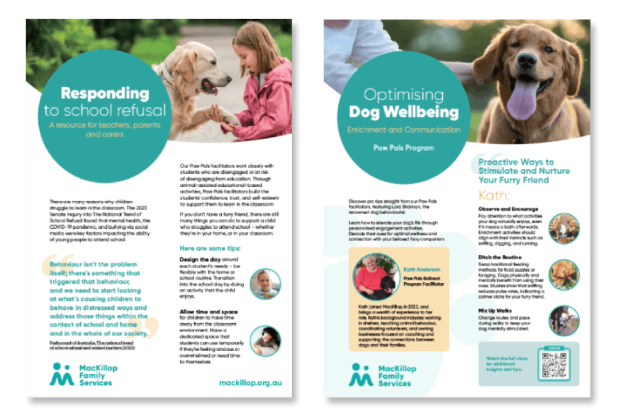 If you’re supporting a child to attend school, we hope you find our tips on responding to school refusal helpful. Alternatively, if you’re a dog lover, we encourage you to watch a short video of our Paw Pals Facilitators and Ambassador Lara Shannon as they share tips on how to ensure your dog stays happy and healthy.